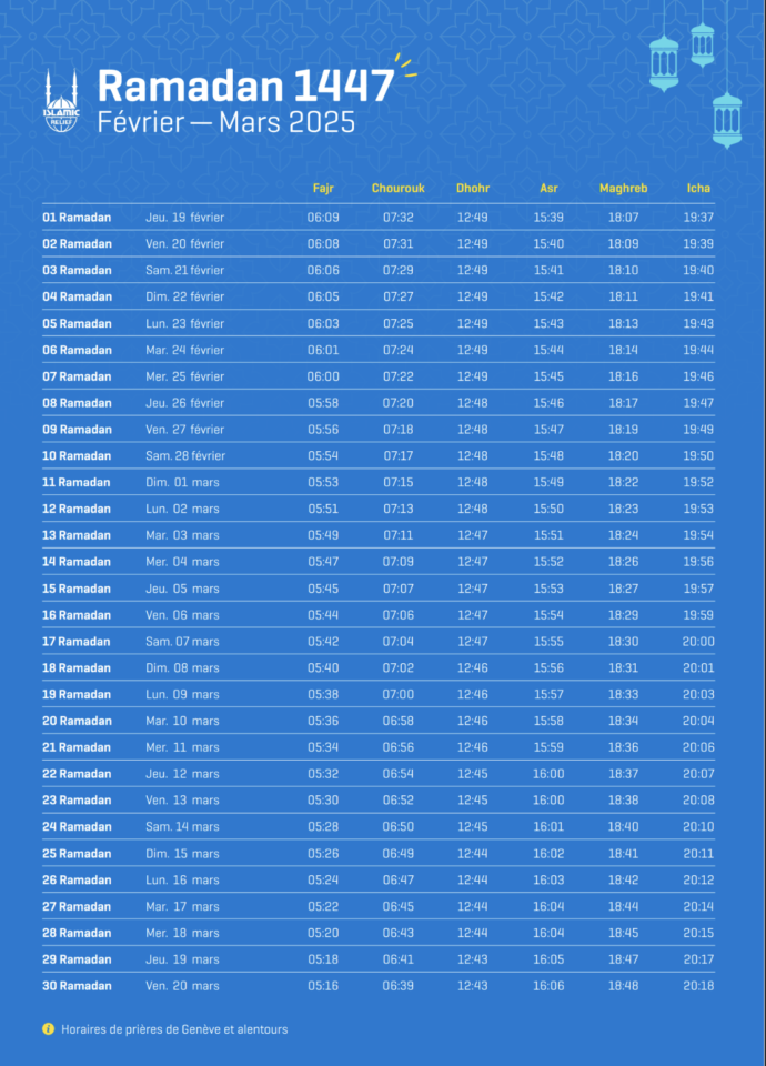 Les horaires de prière suivants pendant le Ramadan indiquent ceux de Genève et de ses environs. Les dates de début et de fin du Ramadan varient en fonction de l’observation de la lune.